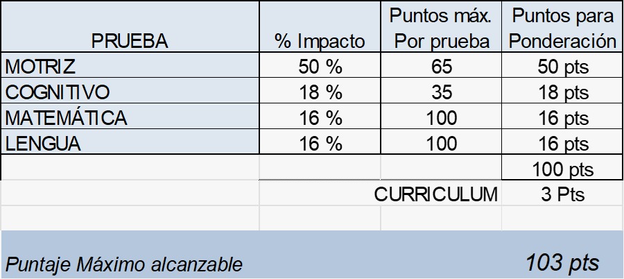 - Motriz: 50% de impacto · 55 puntos máximos por prueba · 50,00 pts para ponderación.